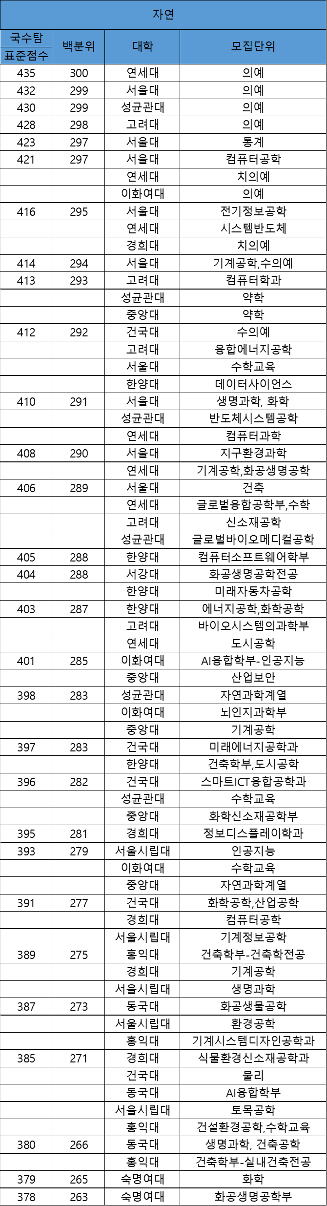 자연계 최상위권인 의예과는 연세대 의예과가 435점, 서울대 432, 성균관대 430, 고려대428점으로 예상합니다. 서울대 전기정보공학 416, 연세대 시스템 반도체 416, 고려대 컴퓨터학 413, 한양대 데이터사이언스 412, 성균관대 반도체시스템공학 410, 한양대 미래자동차공학 404, 서강대 화학생명공학 404, 이화여대 AI융합학부-인공지능 401, 중앙대 산업보안 등 학과가 400점을 넘어야 할 것으로 전망합니다. 건국대 미래에너지공학 397, 경희대 정보디스플레이 395,서울시립대 인공지능 393, 홍익대 건축학부-건축 388, 동국대 화공생물공학 387점 등으로 예상됩니다.