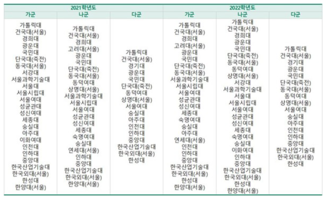 정시모집군은 가, 나, 다 3개군이 있습니다. 정시 지원은 군별로 1개 대학만 지원 가능하여 총 3개 대학 지원을 할 수 있습니다. 카이스트, 유니스트 등 과학기술원 대학은 모집군에 해당하지 않으므로 별도 지원이 가능합니다. 2022년 정시에서 서울대는 가군에서 나군으로 이동했고 고려대와 연세대는 서울대를 피하여 가군으로 이동한 것이 특징입니다. 최상위권 수험생들은 가군, 나군 대학에서 승부를 보게 될 것입니다. 서강대는 나군, 한양대, 성균관대는 가/나 군, 중앙대, 한국외국어대 가.나.다 군, 경희대, 서울시립대, 이화여대 가.나 군, 건국대, 홍익대 가.나.다 군, 동국대는 가/나 군으로 모집합니다. 성균관대 지원 가능한 점수대의 수험생이라면 안정권으로 성균관대 나군, 고려대 또는 연세대 가군 소신 지원, 하향 지원으로 한국외국어대, 중앙대, 건국대를 다군으로 지원을 고려해 볼 수 있겠습니다. 지원 점수에 맞춰 정시모집군의 대학을 잘 선택하는 것은 매우 중요한 첫단계입니다.