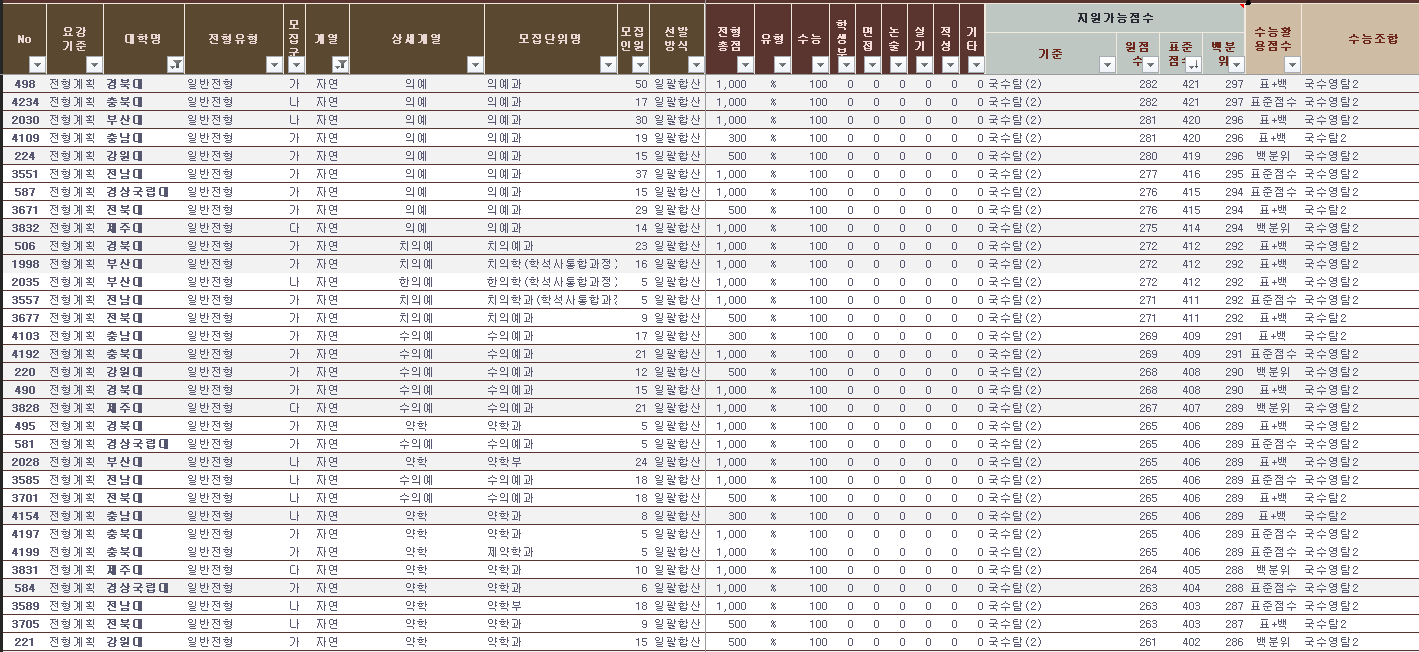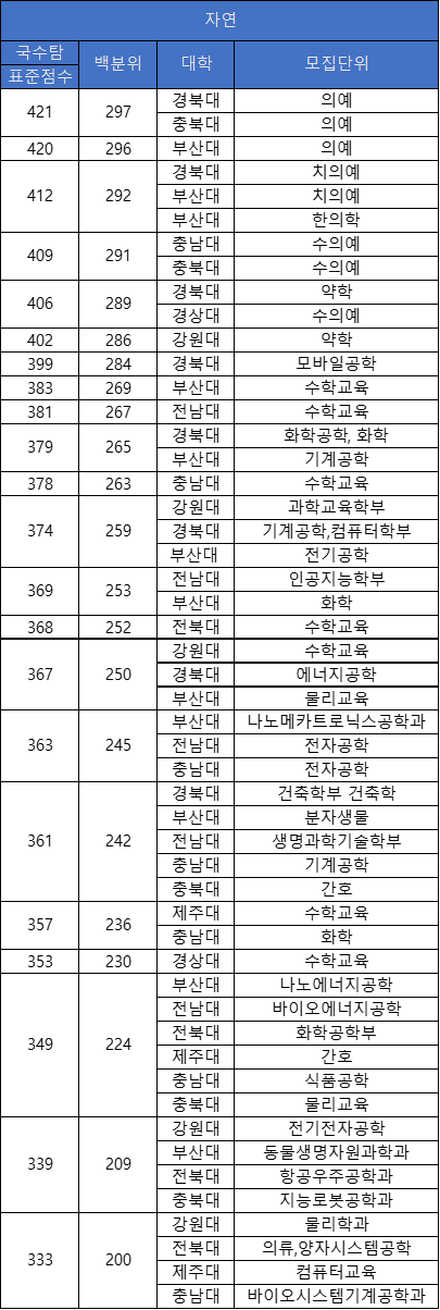이투스에서 작성한 정시배치표를 참고하여 지거국 지원 가능점수, 백분위는 어느 정도 수준인지 확인해 보겠습니다. 표준점수 기준으로 지거국 인문계열은 최저 290점~최고 381점대로 예상됩니다. 자연계열은 282점~421점대로 예상되며 의예과는 수도권 대학과 거의 차이없이 높은 점수대로 형성되어 있습니다.