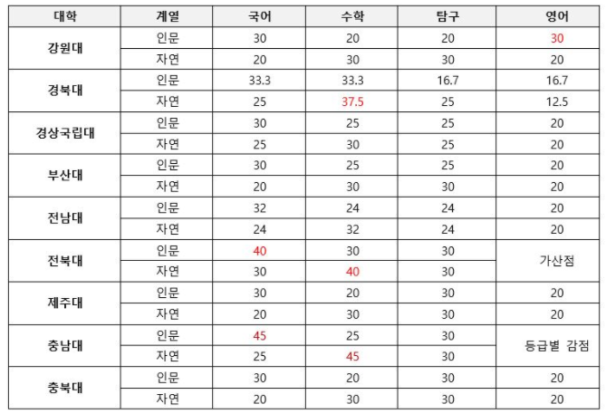 수능 활용지표 항목은 부산대, 경북대, 전북대, 전남대, 충남대는 표준점수와 변환표준점수, 강원대, 제주대는 백분위, 경상대, 충북대는 표준점수를 이용하여 전형을 실시합니다. 인문계 국어 반영 항목에서는 충남대 45%로 가장 많이 반영하며 다음으로 전북대 40%입니다. 경북대 인문계도 국어 점수를 33.3% 반영하여 비교적 높습니다. 인문계 수학 과목은 경북대가 33.3%로 가장 많이 반영합니다. 다음으로 전북대 30%이며 기타 다른 대학은 20~25%수준입니다. 강원대는 인문계 영어 점수를 30%로 가장 많이 반영합니다. 충남대는 영어 과목 등급별 감점입니다.