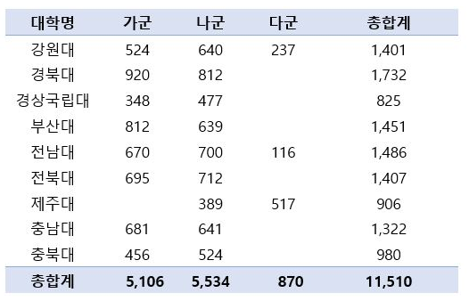 지방거점국립대(지거국)의 정시모집군을 보면 단일군으로 모집하는 대학은 없습니다. 경북대, 경상대, 부산대, 전북대, 충남대, 충북대는 가/나 군 모집, 강원대, 전남대 가/나/다 군, 제주대 나/다군 모집입니다. 정시모집 선발인원은 경북대가 1,732명으로 가장 많이 모집할 예정입니다. 부산대는 1,451명, 전북대 1.407명 모집이며 경상대가 825명으로 가장 적습니다.
