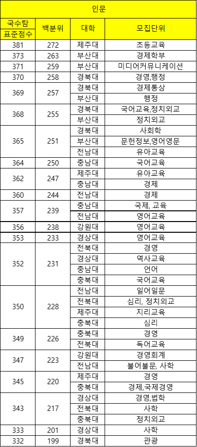 인문계열 예상 지원 점수를 먼저 살펴 보겠습니다. 제주대 초등교육학과의 예상 지원 점수는 표준 점수로는 381점이며 백분위는 272입니다. 제주대의 평가지표는 백분위이니 유의하여 지원하시면 되겠습니다. 부산대 경제학부 373점, 경북대 경영 370점, 전남대 유아교육 365, 충남대 국어교육 364, 전남대 경제 360점 등으로 예상하고 있습니다. 지방거점국립대는 사범대 모집단위 강세입니다.