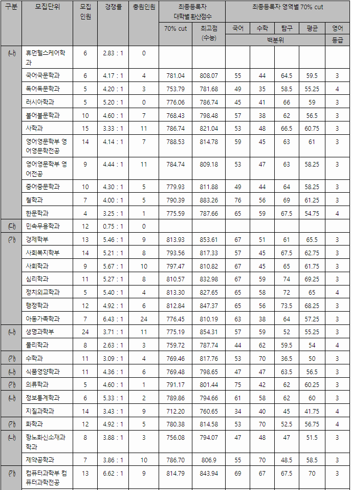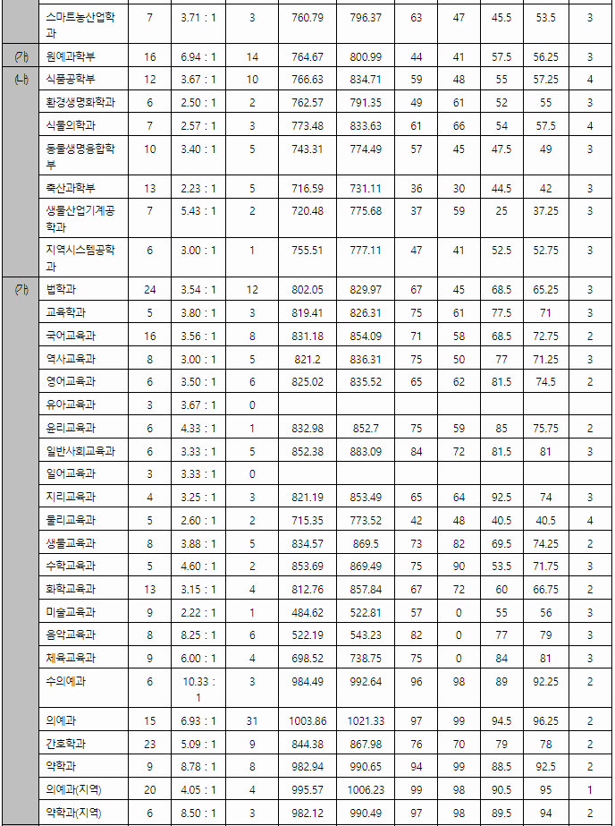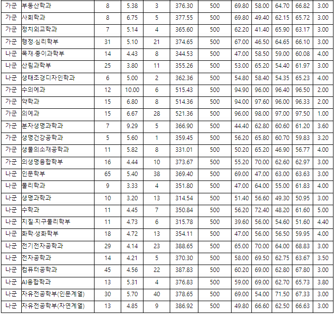 정시배치표 예상지원점수입니다. 인문계 가군 영어교육과 359, 역사교육과 358, 국어교육과 356, 법학과 353, 일어교육과 350, 교육학과 348, 사회복지학부 339, 유아교육과 338, 경제학부 335, 나군 국어국문학과, 경영학부 353, 국제통상학부,경영정보학과 349, 식품자원경제학과 345, 철학과 339, 독어독문학과 331, 자연계 가군 의예 405, 약학과 394, 수의예 393, 수학교육과 351, 화학교육과 344, 간호학과 341, 컴퓨터과학전공, 컴퓨터소프트웨어전공 309, 나군 생물산업기계공학과 343, 화학공학과 340, 환경재료과학과, 전기공학과 환경재료과학과 338, 전자공학과 330, 전기공학과 326, 환경산림과학부 324, 세라믹공학전공 316입니다.