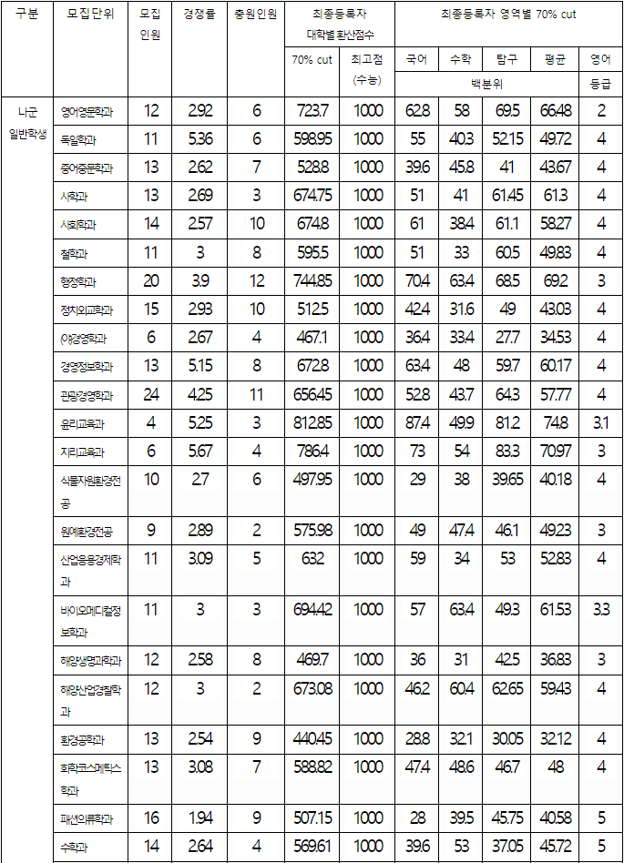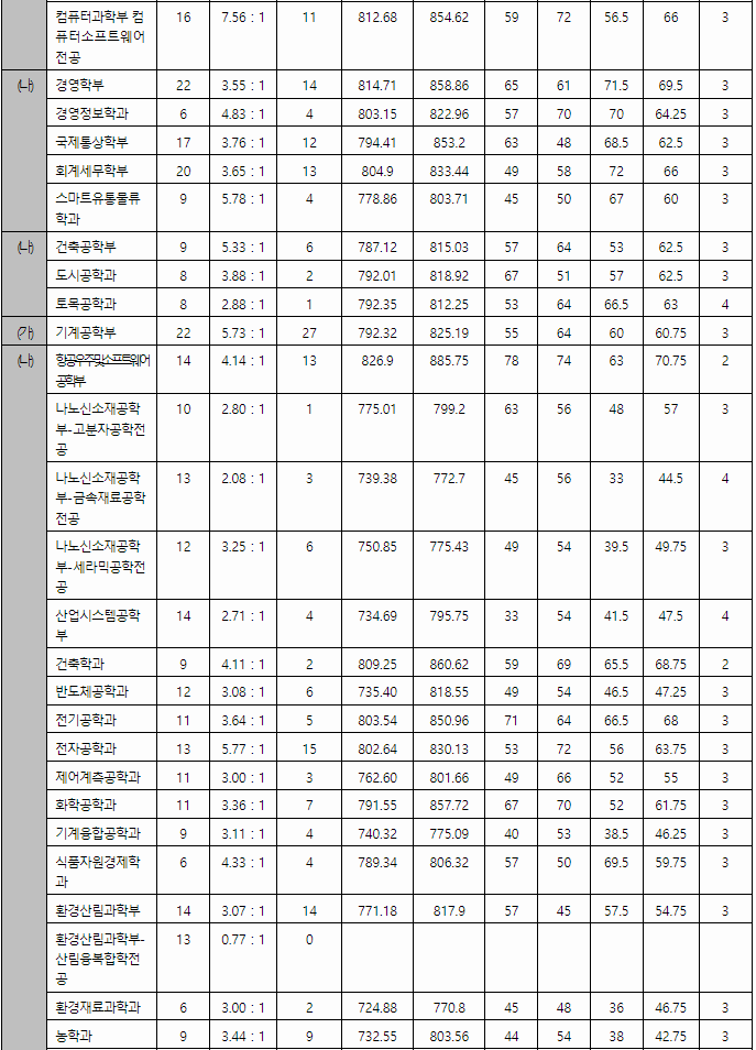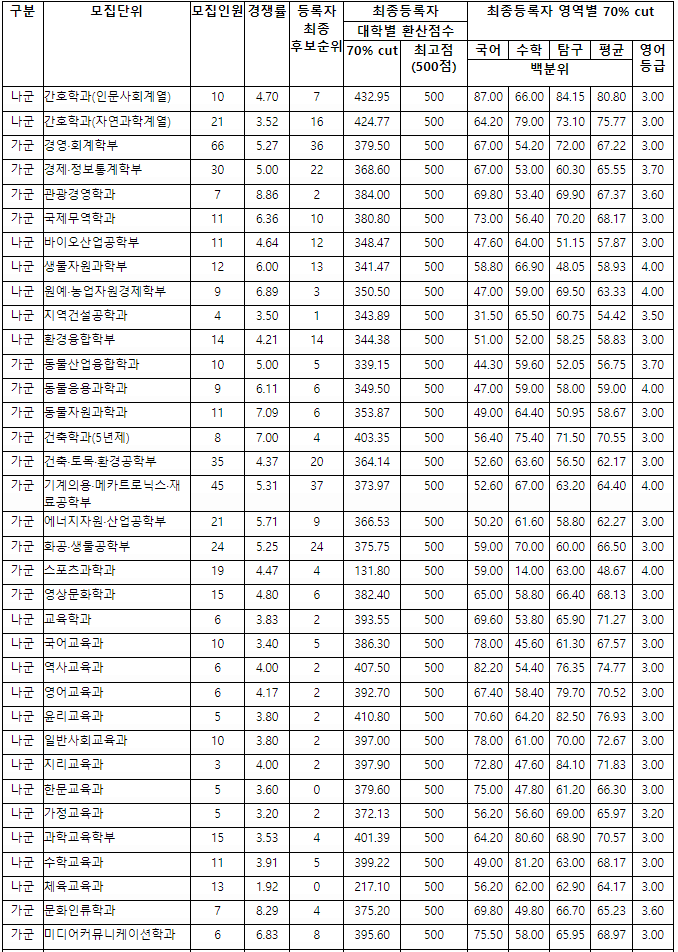 2022/23 경상국립대 정시등급컷, 정시배치표 점수