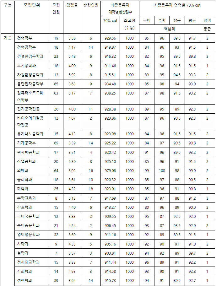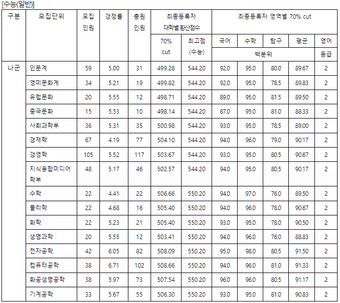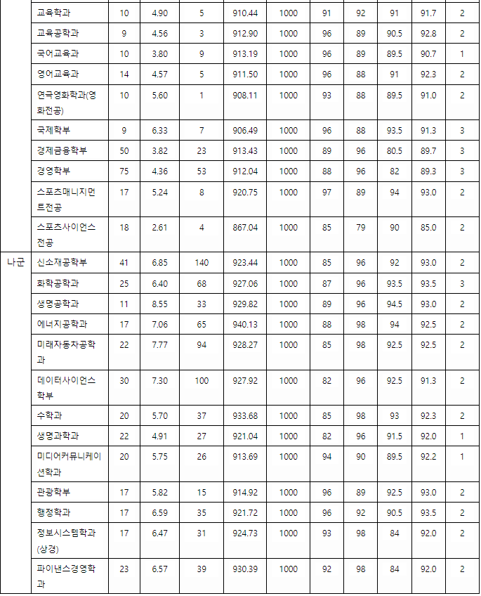 2022학년도 전형 결과입니다. 가군 건축 91.7, 자원환경공학 93.3, 컴퓨터소프트웨어 93.2, 전기공학 92.3, 기계공학 90.8, 의예 99, 간호 90, 국어국문 92, 영어영문 91.5, 사학 91.0, 정치외교 92.2, 교육 91.7, 국어교육 90.7, 국제 91.3, 경영 89.3, 스포츠매니지먼트 93.0, 나군 신소재공학 93.0, 생명공학 93.0, 미래자동차공학 92.5, 데이터사이언스 91.3, 미디어커뮤니케이션 92.2, 관광 93.0, 파인낸스경영 92.0이며 최종등록자 영역별 백분위 70% 컷입니다.