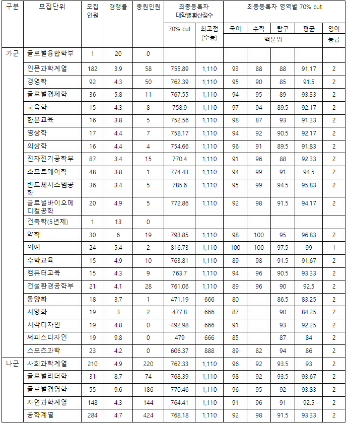 정시배치표 지원 참고점수를 보면 가군 글로벌경제, 경영 391, 인문과학계열 388, 교육학 387, 의상학 386, 의예 410, 약학 399, 반도체시스템공학 393, 전자전기공학 389, 건설환경공학 384, 나군 글로벌경영 393, 글로벌리더 392, 사회과학계열 391, 소프트웨어학 391, 자연과학계열 388점으로 추정합니다.