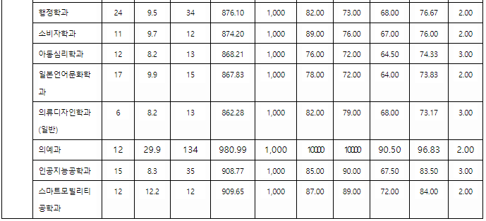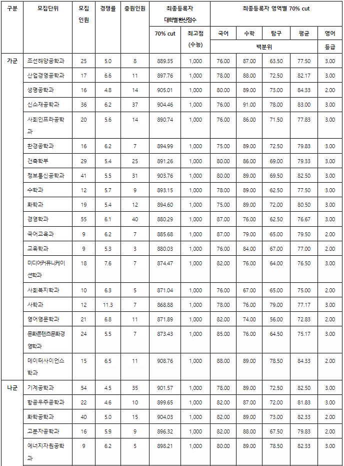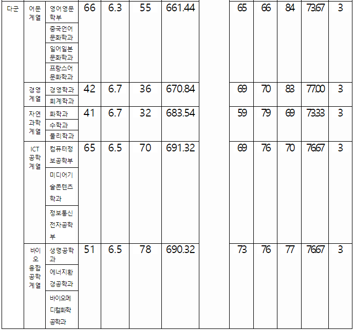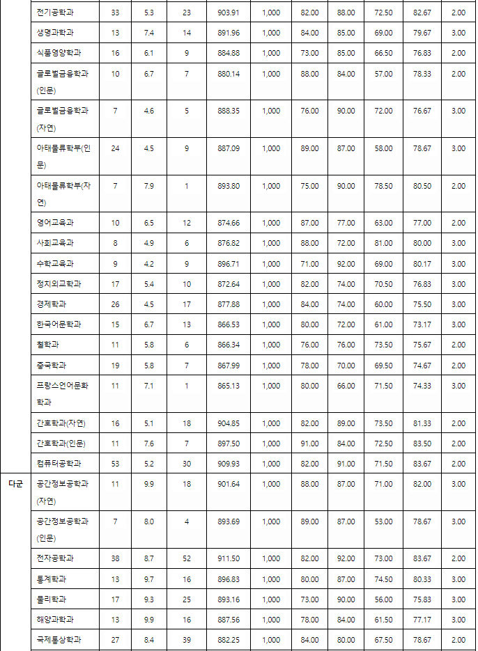 지원 예상점수입니다. 가군 자유전공 372, 경영, 미디어커뮤니케이션 371, 국어교육 369, 사학 368, 사회복지 367, 영어영문 365, 나군 아태물류 376, 글로벌금융 374, 사회교육 371, 영어교육, 정치외교 368, 경제 367, 한국어문학 365, 다군 국제통상 371, 행정 370, 아동심리 368, 의류디자인 364, 자연계 가군 데이터사이언스 371, 자유전공 370, 산업경영공학 367, 화학 366, 건축 365, 자유공학 359, 미래모빌리티 343,  나군 항공우주공학, 컴퓨터공학 373, 에너지자원공학 370, 수학교육 367, 고분자공학 366, 글로벌금융(자연) 362, 다군 의예 409, 스마트모빌리티공학과 382, 인공지능공학 380, 전자공학 379, 전기공학 373, 통계학과 368, 생명과학 366, 물리 365로 예상합니다.