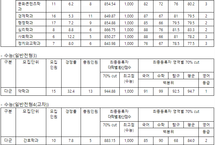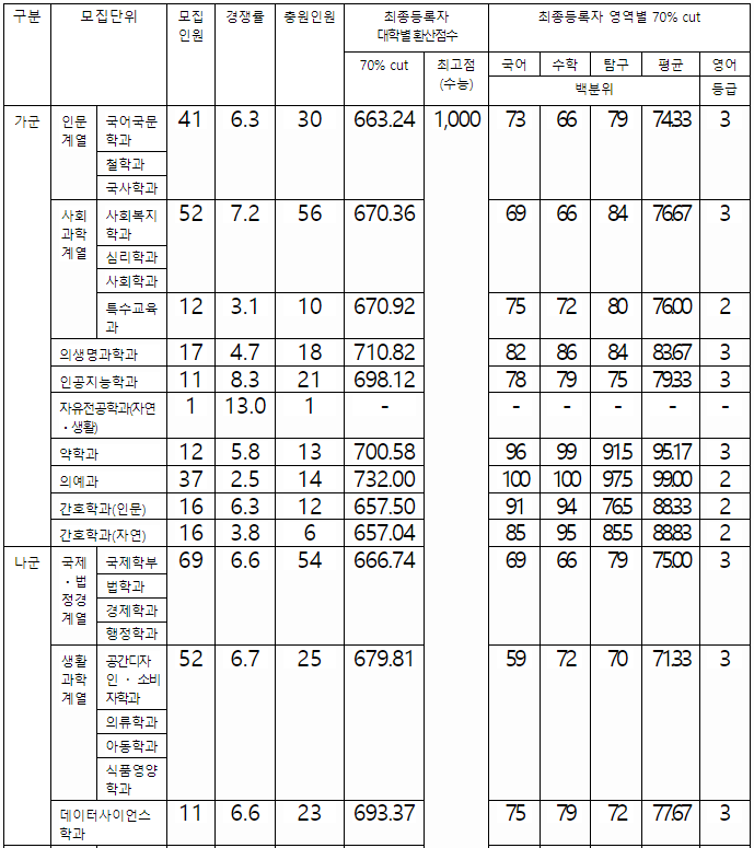 2022년 정시 전형결과입니다. 가군 인문계열 74.33, 사회과학계열 76.67, 의생명과학 83.67, 약학 95.17, 의예 99.00, 간호(인문) 88.33, 간호(자연) 88.83, 나군 국제, 법정경계열 75.00, 생활과학계열 71.33, 데이터사이언스학과 77.67, 다군 어문 계열 73.67, 경영계열 77.00, 자연과학계열 73.33, ICT 공학계열 76.67, 바이오융합공학계열 76.67입니다.