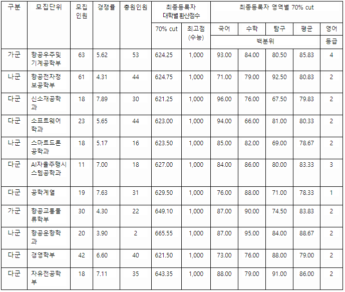 2022/23 항공대 정시등급컷, 정시배치표 점수