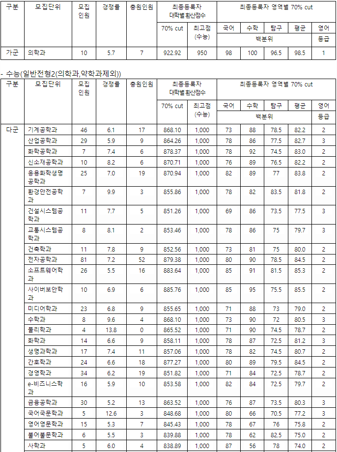 2022/23 아주대 정시등급컷, 정시배치표 점수