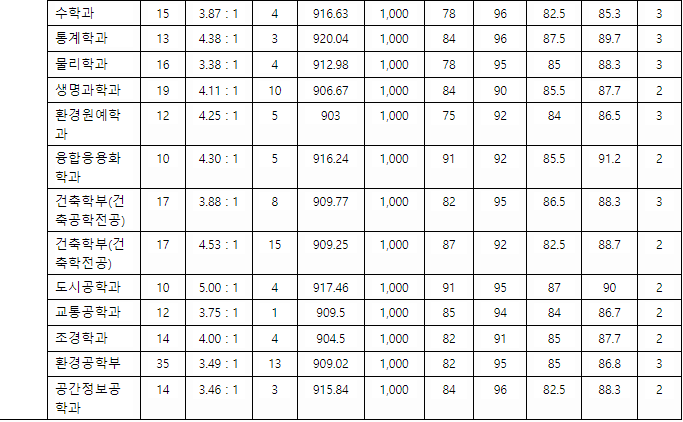 표준점수 기반 지원가능 점수대 예상입니다. 가군 자유전공학부 385, 도시행정 385, 인공지능학 381, 나군 세무 388, 경영, 경제 383, 국제관계 381, 사회복지 380, 철학 379, 국어국문 378, 전자전기컴퓨터공학 384, 통계 384, 도시공학, 수학 380, 생명과학 379, 건축학 전공 377, 조경학 374점으로 예상합니다.