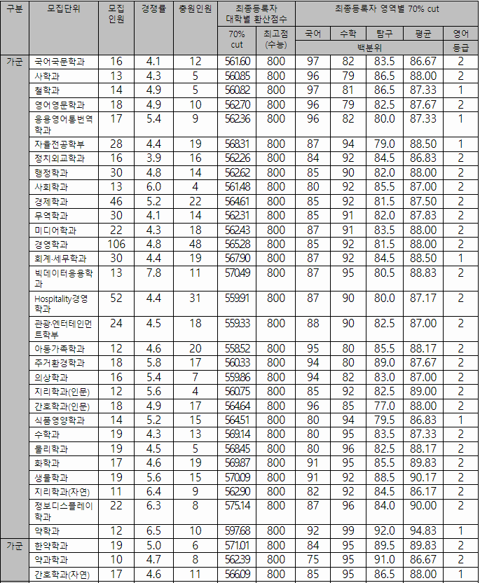 2022년도 전형결과입니다. 가군 국어국문 86.67, 사학 88.00, 자율전공 88.50, 정치외교 86.83, 경제 87.50, 경영 88.00, 의상 87.00, 간호(인문) 88.00, 수학 87.33, 정보디스플레이 90, 약학 94.83, 나군 국제 83.83, 한의예 95.67, 기계공학 88.50, 건축공학 85.50, 컴퓨터공학 90.00, 우주과학 84.50, 의예 98.50, 치의예 97.00, 연극영화학 영화연출,제작 95.50, 체육 92.00, 스포츠의학 92.00, 태권도 85.00입니다.