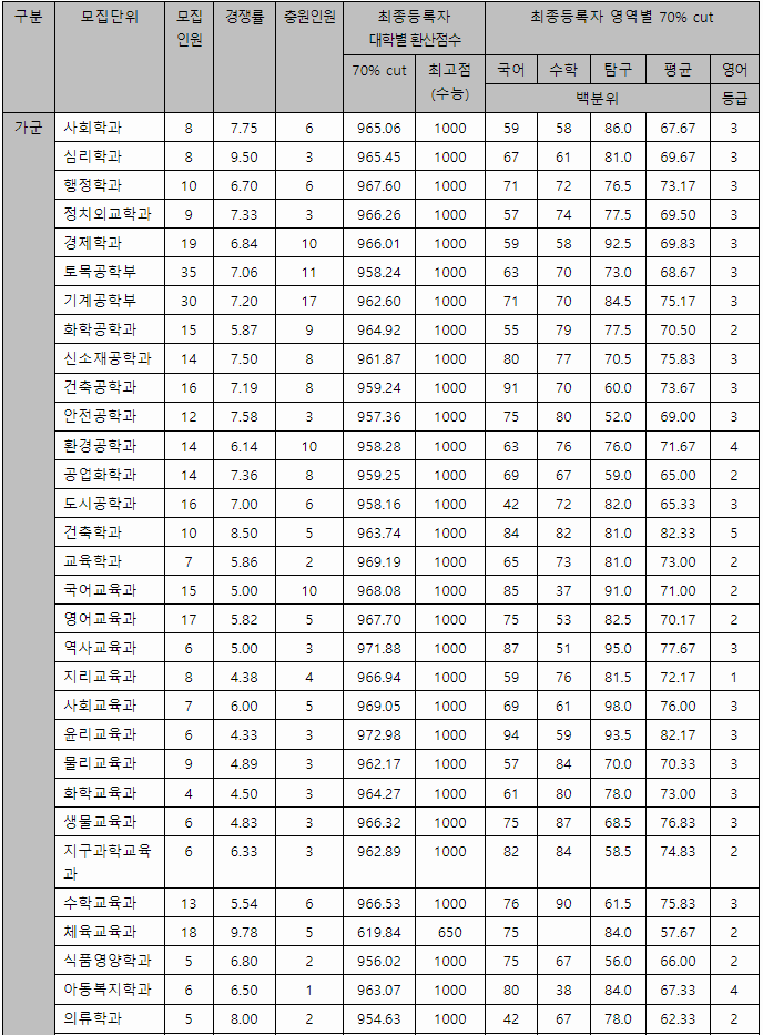 2022/23 충남대 정시등급컷, 정시배치표 점수