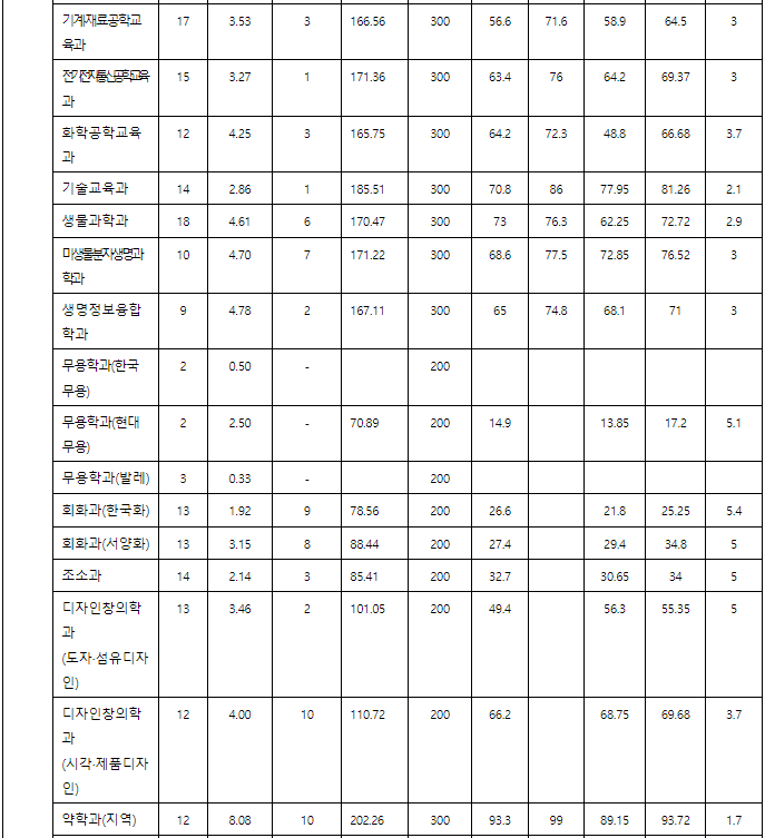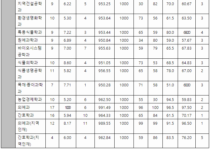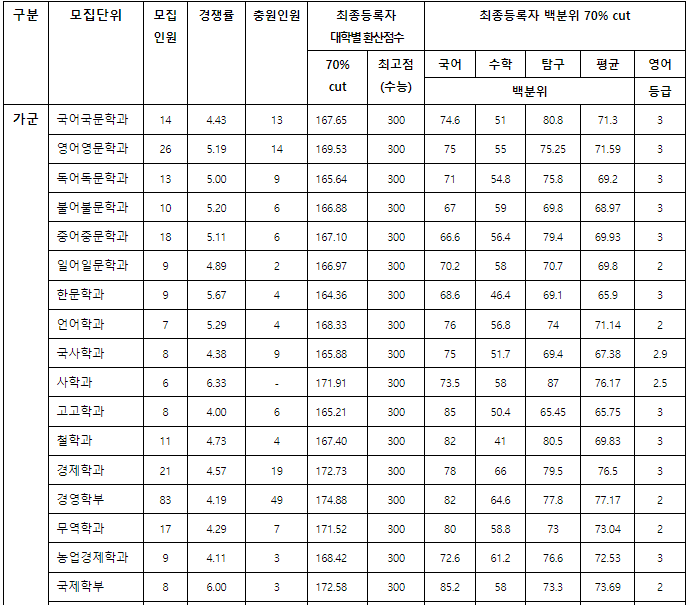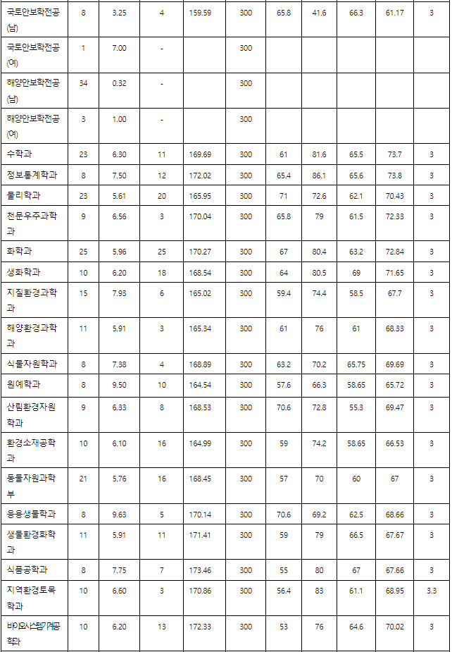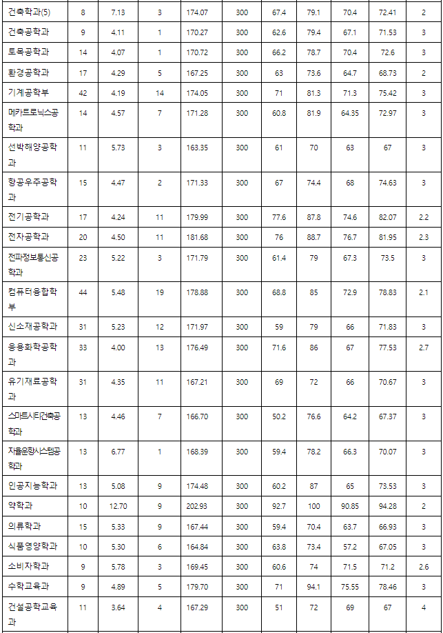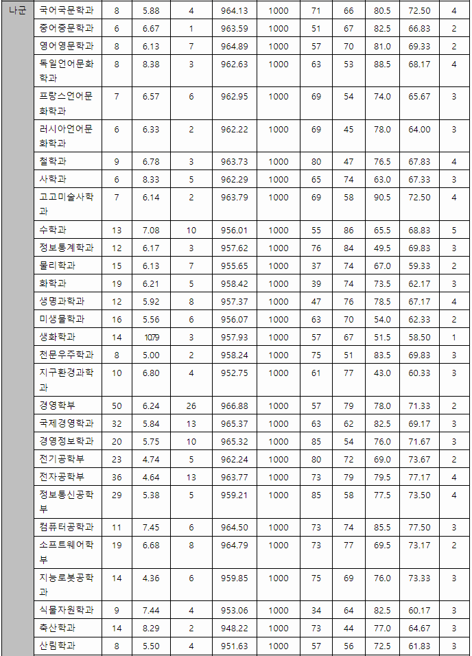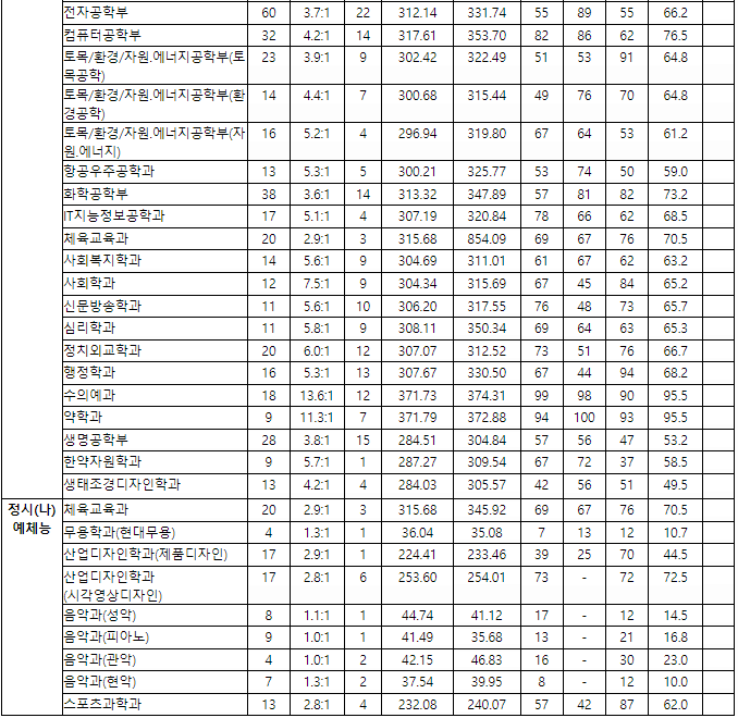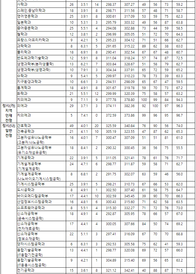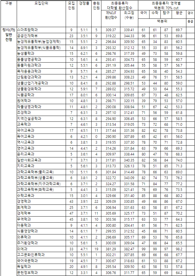 정시배치표 참고 점수입니다. 인문계 가군 경영 368, 경영 366, 무역 364, 사학과 362, 국어국문 360, 언어 359, 국사 357, 한문 356, 나군 국어교육과, 행정 368, 언론정보 366, 영어교육 366, 정치외교 363, 사회복지 362, 문헌정보 360, 자연계 가군 의예 408, 수의예 397, 간호 359, 생화학 358, 화학 356, 식품공학 351, 응용생물 350, 수학 349, 천문우주과학과 344, 물리 343, 생물환경화학과 335, 바이오시스템기계공학과 330, 나군 약학 395, 수학교육과 372, 전자공학과 361, 기계공학부 358, 미생물분자생명과학과 355, 생명정보융합학과, 신소재공학과 351, 건축학과, 항공우주공학과 350, 전파정보통신공학과, 환경공학과 347, 스마트시티건축공학과 345, 의류학과 344, 자율운항시스템공학과 341, 전기전자통신공학교육과 337점으로 예상합니다.