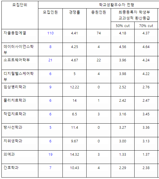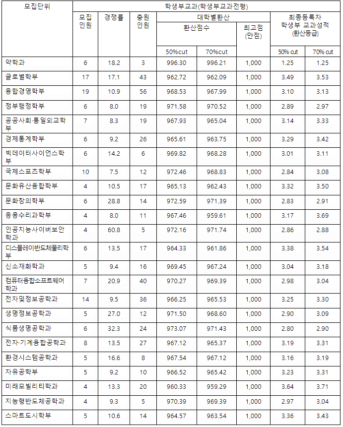 2022년도 수시등급을 보면 학생부 교과 성적 70%컷 기준으로 약학과 1.25, 글로벌 3.53, 경제통계 3.42, 응용수리 3.69, 컴퓨터 융합소프트웨어학과 3.04, 식품생명공학 2.90, 자유공학 3.31, 스마트도시 3.43입니다. 가장 높은 경쟁률을 기록한 모집단위는 인공지능사이버보안학과로 60.8대1이었으며 70%컷은 2.88등급이었습니다.