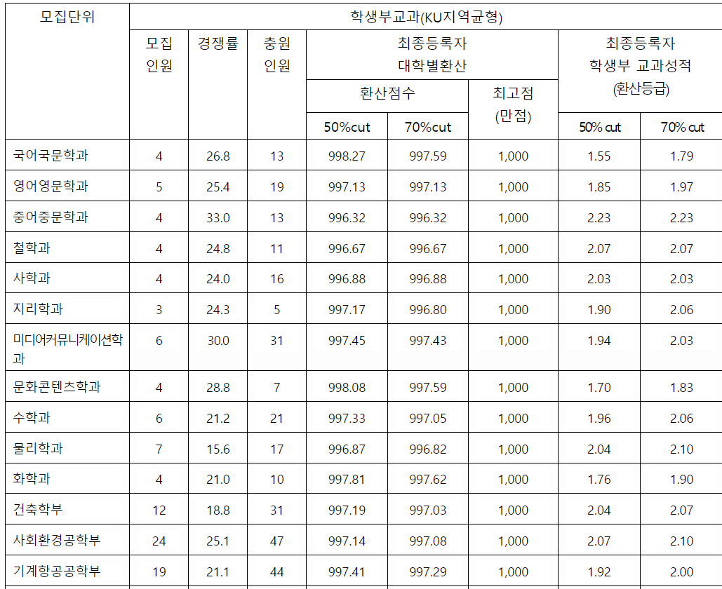 학생부종합(KU자기추천) 70%수시등급컷입니다. 국어국문 3.87, 중어중문 4.05, 철학 3.93, 물리 2.43, 건축 3.04, 전기전자 2.32, 화학공학 2.23, 정치외교 2.46, 경제 2.80, 글로벌비즈니스 4.32, 부동산 3.21, 의생명공학 2.38, 융합생명공학 2.13, 식량자원과학 2.76, 수의예 1.33, 수학교육 2.12입니다.