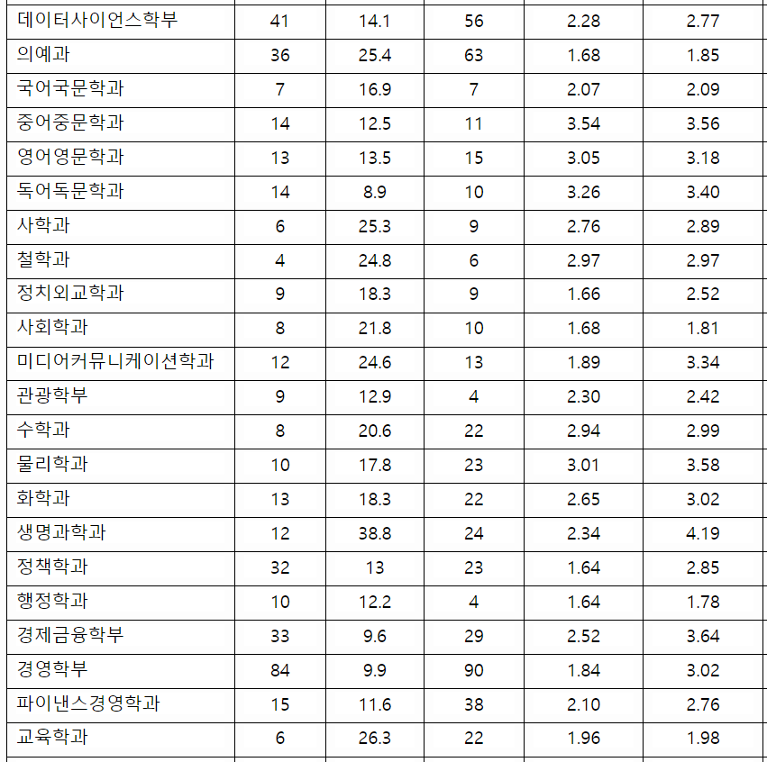 서강대 학생부교과(고교장추천) 입시 결과를 확인해 보겠습니다. 2022학년도 수시등급 컷 최종합격자 70%컷입니다. 인문계 1.65, 사회과학부 1.49, 경영학 1.38, 지식융합미디어학부 1.52, 수학 1.55, 전자공학 1.52, 컴퓨터공학 1.56입니다. 서강대 학생부교과 합격을 위해서는 교과 성적이 1등급내로 우수해야 가능합니다. 학생부종합(일반전형) 결과를 보면 국어국문학 3.76, 철학 4.39, 사회학 1.71, 정치외교학 2.82, 경제학 3.21, 글로벌한국학 2.96, 생명과학 2.07, 전자공학 2.13, 기계공학 3.21입니다.