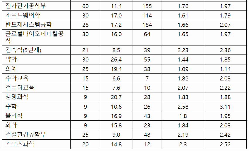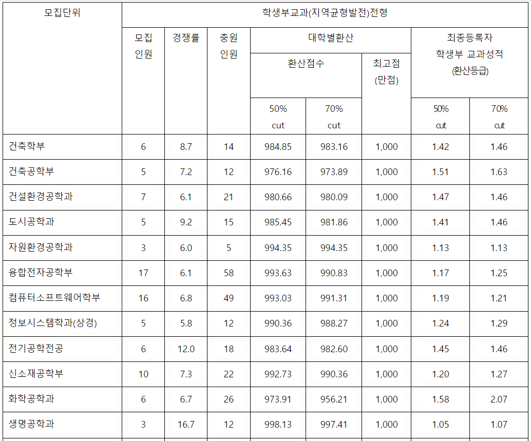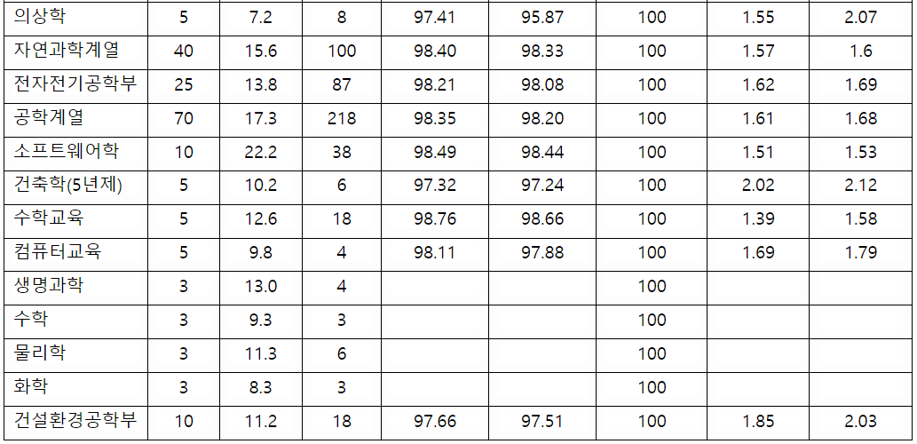 2022학년도 수시등급컷 70% 결과를 확인해 보겠습니다. 학생부 교과 결과를 보면 건축학부 1.46, 자원환경공학 1.13, 컴퓨터소프트웨어학부 1.21, 신소재공학부 1.27, 화학공학 2.07, 생명공학 1.07, 산업공학 1.27, 국어국문 1.59, 사학 1.46, 정치외교 1.45, 미디어커뮤니케이션 1.38, 관광 1.67, 행정 1.28, 경영 1.53, 파이낸스경영 1.36, 미래자동차공학 1.32, 국어교육 1.15, 간호 1.32 등입니다. 학생부 위주인 학생부 종합 수시등급컷은 학생부교과 보다는 낮지만 서류 위주라는 것을 감안해야 합니다. 1~4등급대로 다양하게 분포하고 있으며 2~3등급대가 다수입니다. 도시공학 3.24, 전기공학 전공 2.10, 생명공학 1.52, 미래자동차공학 1.70, 의예 1.85, 미디어커뮤니케이션 3.34, 중어중문 3.56, 수학 2.99, 정책 2.85, 교육공학 1.86, 의류학과(자연) 4.01, 국제학부 3.74입니다.