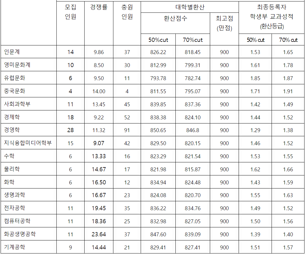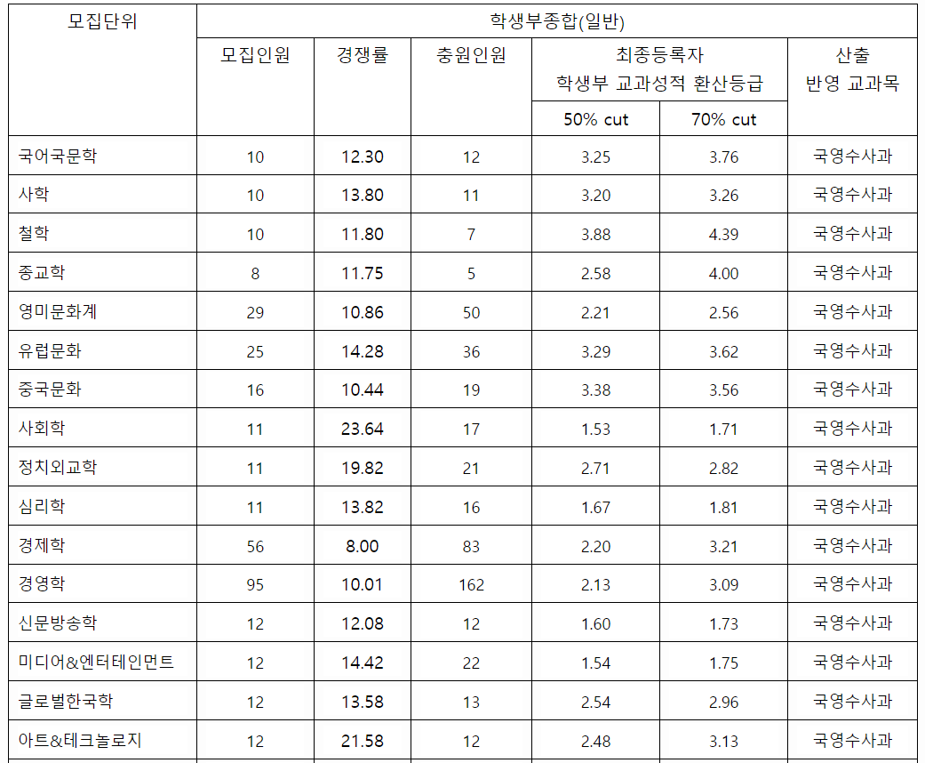 2022/23 서강대 수시모집, 수시등급컷