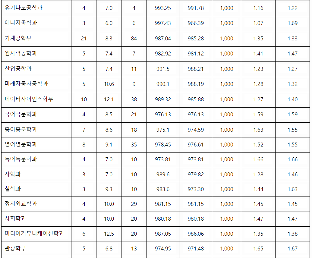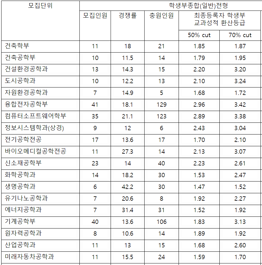 2022학년도 수시등급컷 70% 결과를 확인해 보겠습니다. 학생부 교과 결과를 보면 건축학부 1.46, 자원환경공학 1.13, 컴퓨터소프트웨어학부 1.21, 신소재공학부 1.27, 화학공학 2.07, 생명공학 1.07, 산업공학 1.27, 국어국문 1.59, 사학 1.46, 정치외교 1.45, 미디어커뮤니케이션 1.38, 관광 1.67, 행정 1.28, 경영 1.53, 파이낸스경영 1.36, 미래자동차공학 1.32, 국어교육 1.15, 간호 1.32 등입니다. 학생부 위주인 학생부 종합 수시등급컷은 학생부교과 보다는 낮지만 서류 위주라는 것을 감안해야 합니다. 1~4등급대로 다양하게 분포하고 있으며 2~3등급대가 다수입니다. 도시공학 3.24, 전기공학 전공 2.10, 생명공학 1.52, 미래자동차공학 1.70, 의예 1.85, 미디어커뮤니케이션 3.34, 중어중문 3.56, 수학 2.99, 정책 2.85, 교육공학 1.86, 의류학과(자연) 4.01, 국제학부 3.74입니다.