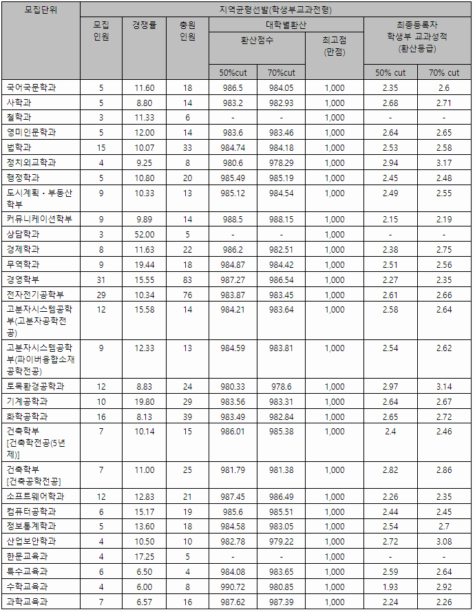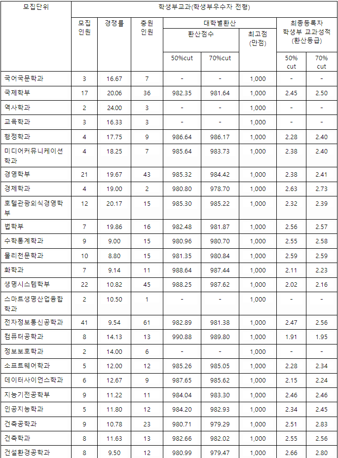 학생부교과전형 수시등급컷을 확인해 보겠습니다. 최종등록자 70%컷 기준입니다. 먼저 학생부 교과 지역균형전형입니다. 국제학부 1.78, 경영학부 1.73, 컴퓨터공학 1.79, 호텔관광외식경영학부 2.22, 건설환경공학 2.37입니다. 학생부우수자전형 결과를 보면 국제학부 2.50, 행정 2.40, 경제 2.73, 물리천문 2.59, 컴퓨터공학 1.95, 인공지능 2.45, 건축공학 2.83, 건축 2.56, 데이터사이언스 2.24, 나노신소재공학 2.56입니다.