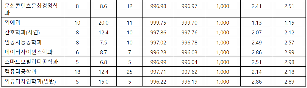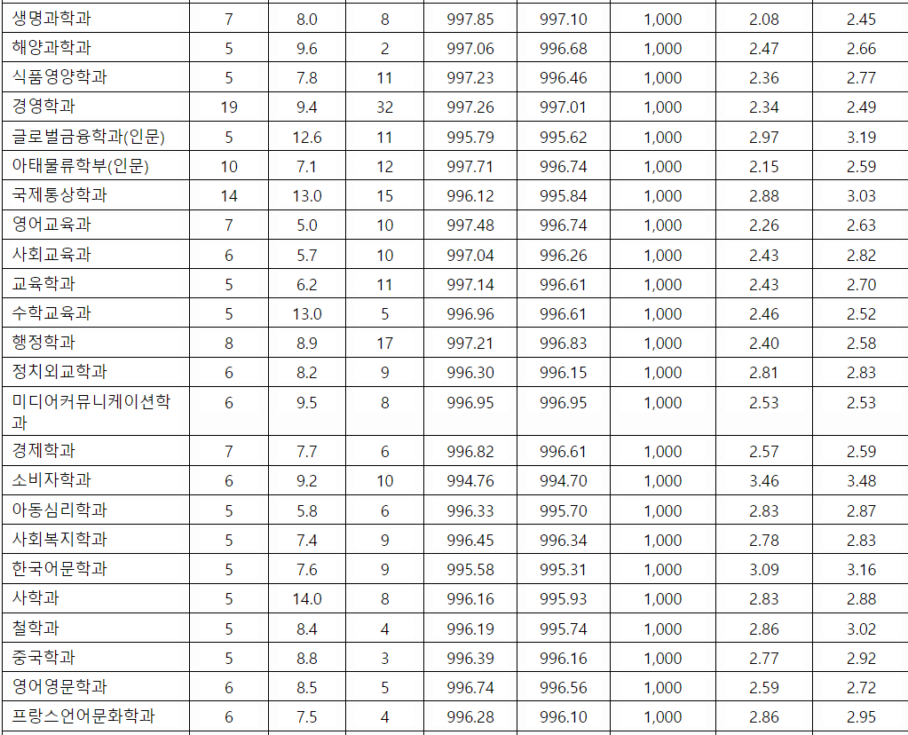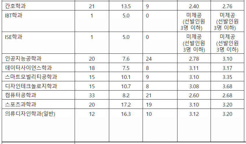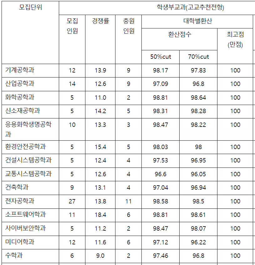 학생부 종합 전형 결과입니다. 70%컷 기준입니다. 국어국문 3.70, 사학 3.54, 문예창작 3.88, 공공안전 3.04, 경제 4.13, 경영 3.62, 수학 3.49, 화학 3.41, 전자공학 3.94, 미디어 영상 3.28, 관광 3.67입니다. 교과 전형 등급대는 2등급 후반~3등급 중반대입니다.