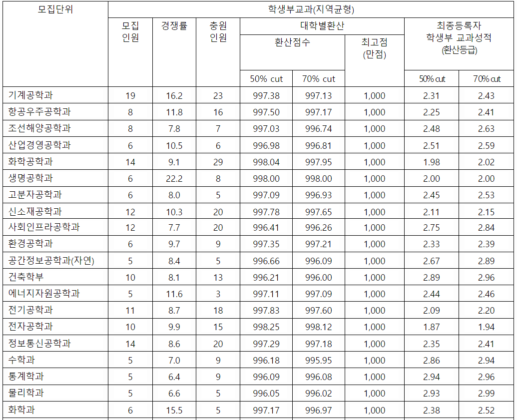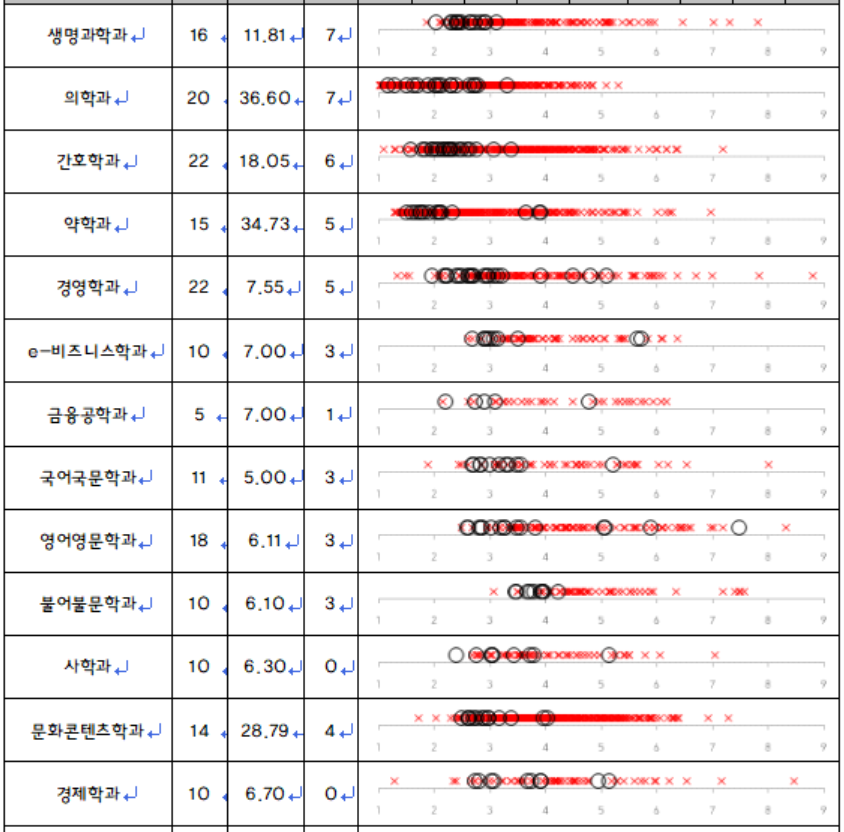 아주대 학생부 종합 전형 결과는 분포도로 공개되어있습니다. 지원자 분포도를 참고하시기 바랍니다. 교과부 전형 결과도 아주대는 대학 환산 점수로 표시하고 있습니다. 교과 전형 성적대는 2등급 중후반대, 학생부 종합 전형은 2등급 후반~3등급 초중반대입니다.