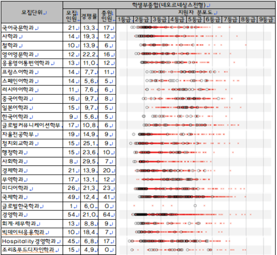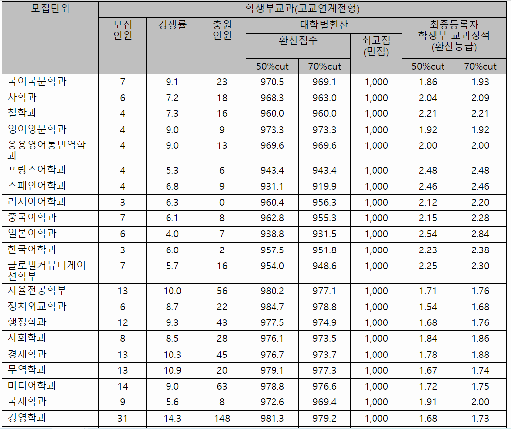 학생부 교과 전형 수시등급컷입니다. 국어국문 1.93, 프랑스어학 2.48, 한국어 2.38, 글로벌커뮤니케이션 2.30, 자율전공 1.76, 정치외교 1.68, 경제 1.88, 국제 2.00, 경영 1.73, 의상 2.04, 수학 1.95, 화학 1.67, 기계공학 1.91, 건축공학 2.12, 전자공학 1.70, 응용수학 1.91, 한약 1.82, 약과학 1.56, 의류디자인 1.90, 체육 1.30, 스포츠의학 1.40입니다. 학생부종합 네오르네상스전형 결과는 분포도로만 공개되어있으니 참고하시기 바랍니다.