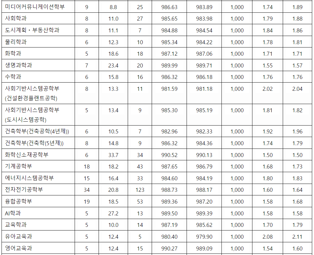 2022학년도 중앙대 서울캠퍼스 수시모집 입결입니다. 먼저 학생부교과(지역균형)부터 알아보겠습니다. 최종등록자 학생부 교과 성적 70%컷입니다. 국어국문학과 1.96, 영어영문 2.04, 역사 2.23, 정치,국제 1.89, 공공인재 1.76, 문헌정보 2.00, 사회 1.88, 화학 1.71, 수학 1.76, 기계공학 1.73, 전자전기공학 1.64, 융합공학 1.68, 교육 1.79, 유아교육 2.11, 경영학부 1.71, 경제 1.83, 약학부 1.39, 간호(자연)1.78, 시스템생명 2.21, 예술공학 4.57입니다. 학생부종합 전형에서는 국어국문 2.76, 영어영문 2.15, 철학 2.09, 유럽문화학부(러시아) 4.55, 심리 2.14, 문헌정보 2.40, 미디어커뮤니케이션 3.61, 물리 2.24, 기계공학 2.01, AI 2.19, 교육 3.80, 경제 2.20, 국제물류 3.23, 예술공학 4.05입니다.