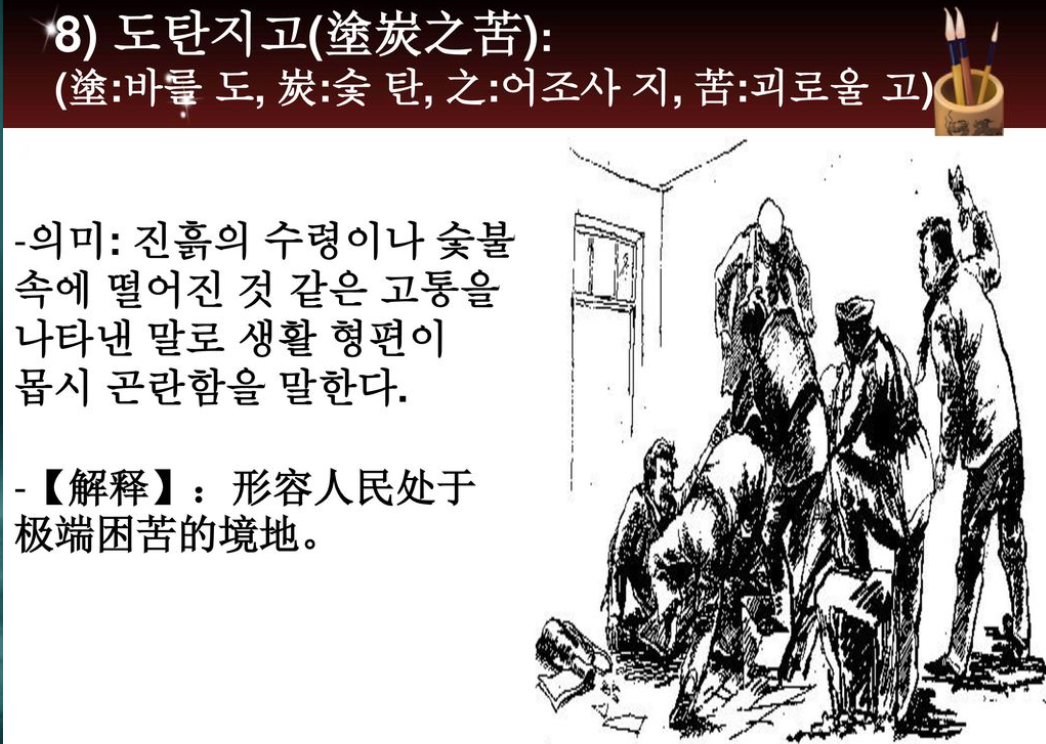 ‘도탄지고’는 ‘도’가 흙구렁(진구렁), ‘탄’이 숯불, ‘지’가 의, ‘고’는 괴로움으로, 흙구렁이나 숯불 속에 빠졌다는 뜻으로 매우 괴로운 경우를 말합니다. 출전은 <서경>의 ‘중훼지고’ 편입니다. 주지육림으로 유명한 방탕한 왕 하나라의 걸왕을 축출하고 새로운 왕이 된 탕왕에게 신하인 중훼가 지어올린 글에서 나오는 말입니다. 생활고에 시달리고 지쳐있는 현시대를 가장 극명하게 나타내는 사자성어일 것입니다.
