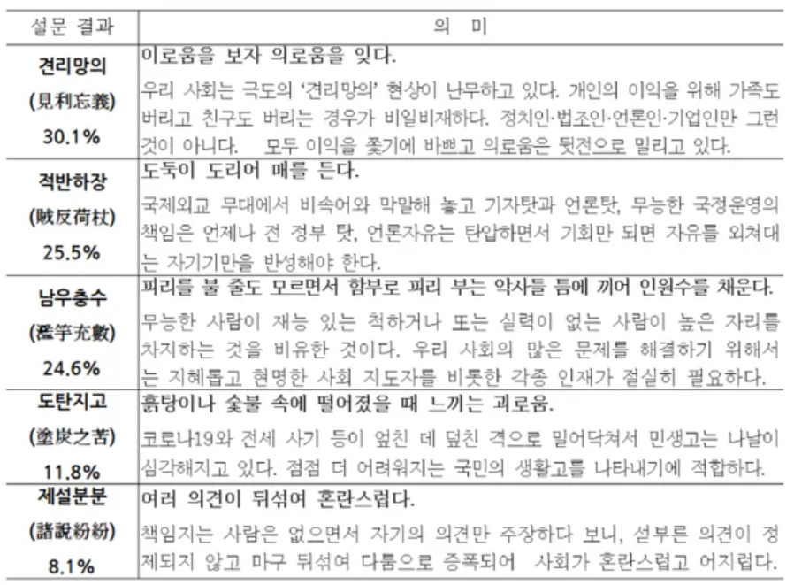 대학교수들은 매년말 그해를 나타내는 사자성어를 선정, 발표하고 있습니다. 올해에도 지난해와 마찬가지로 사자성어가 선정되었습니다.