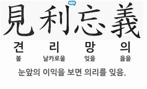 1위로 선정된 견리망의는 '눈앞의 이익을 보면 의리를 잊는다'는 뜻입니다. 논어 '헌문편(憲問篇)'에 등장하는 '견리사의(見利思義)'와 대비되는 표현으로 이 뜻은 '이익을 보면 의로움을 생각하라'라는 뜻인데 생각할 사가 잊어버린다 망으로 바뀌면 이익을 보면 의리를 잊는다는 반대의 뜻이됩니다. 개인의 이익을 위하여 주변을 버리고 사익을 취하는 세태를 꼬집은 사자성어가 되겠습니다. 의로움은 사라지고 망각하고 있는 시대에 살고 있습니다.