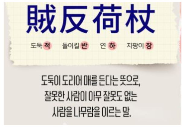 적반하장은 널리 알려진 사자성어입니다. 잘못한 사람이 도리어 아무 잘못도 없는 사람을 나무란다는 뜻으로 모든 것을 남의 탓으로 돌리고 특히 정권이 바뀐지 2년여가 되어가도 전정권을 탓하고 있는 현정권을 비판하는 의미가 큽니다. 출처는 賊反荷杖, 以比理屈者反自陵轢(적반하장, 이배리굴자반자육력)으로 도리에 어긋난 자가 도리어 스스로 성내고 업수이 여긴다는 것을 비유한 말로 조선 효종 때의 문신, 학자인 홍만종이 지은 순오지(旬五志)에서 나왔습니다.