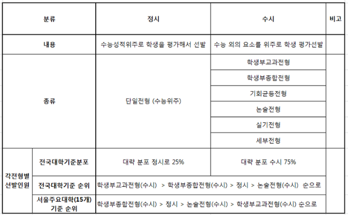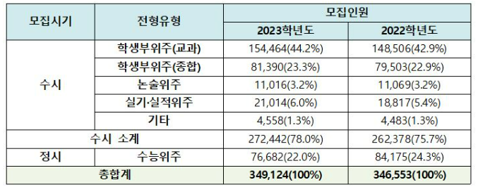수시모집은 전체 모집 비율에서 78.0%를 차지하고 있으며 정시모집은 22.0%로 대부분을 차지하고 있지만 인서울 주요 대학은 정시 모집 비율이 40%대까지 높아져 있는 점을 감안하면 주요 대학 기준으로 수시 모집의 비중은 이전보다는 많이 떨어진 셈입니다.