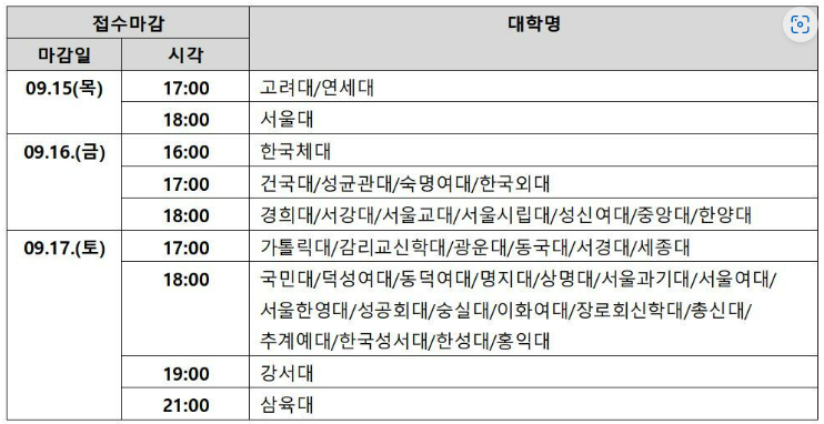 마감시간도 반드시 확인해야 낭패를 면할 수 있습니다. 9월 15일 마감 고려대, 연세대는 17시, 서울대는 18시입니다. 9월 16일 마감 건국대, 성균관대, 숙명여대, 한국외대는 17시, 경희대, 서강대, 서울시립대, 중앙대, 한양대 18시까지 접수해야 합니다. 9월 17일은 광운대, 동국대, 세종대 17시, 국민대, 숭실대, 이화여대, 홍익대 18시까지입니다. 원서를 접수했다면 원서 저장을 확인하고 결제까지 완료해야 접수가 완료되므로 반드시 마무리까지 진행해야 합니다. 수험번호나 접수번호가 확인되었다면 정상적으로 접수가 된 것입니다.