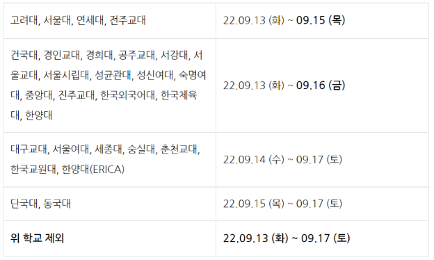 2022년도 주요 대학별 수시모집 원서기간, 마감시간