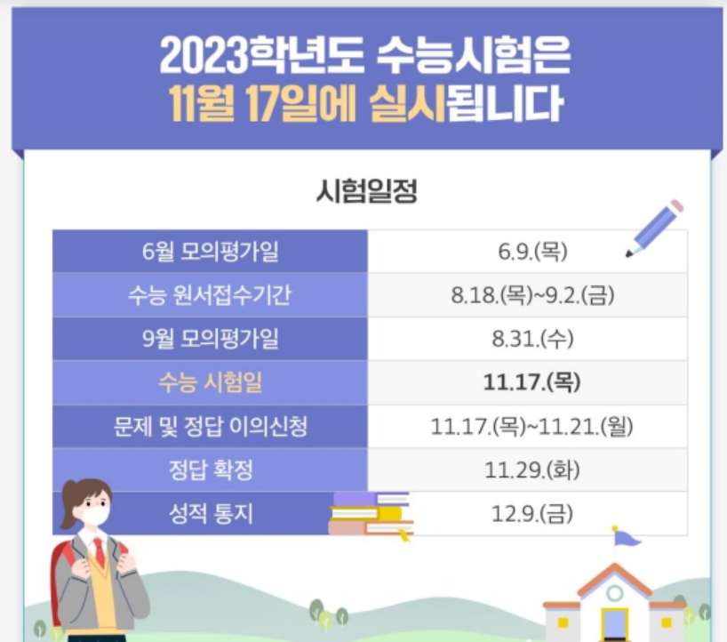 2023학년도 대학수학능력시험일은 2022년 11월 17일 목요일입니다. 코로나 이후 세번째로 치러지는 수능시험으로 이제는 수험생들에게도 좀더 익숙한 환경에서 치러지게 될 것 같습니다. 물론 마스크 착용을 하고 시험을 보는 것은 불편한 것은 사실이지만 그래도 많은 수험생들이 어느 정도는 적응을 했을 것으로 보입니다.