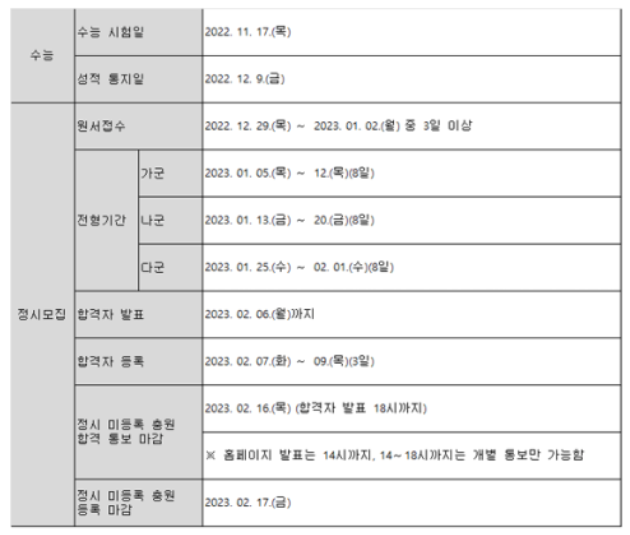 수시모집이 마감되면 수능성적 위주인 정시모집 원서 접수가 시작됩니다. 정시 원서접수 기간은 12월 29일부터 2023년 1월 2일 중 3일 이상입니다. 전형 기간은 가나다군별로 차이가 있으며 1월 5일부터 2월 1일까지입니다. 정시모집 합격자 발표는 2023년 2월 6일까지이며 등록은 2월 7일부터 9일까지, 미등록 충원 마감은 2월 17일입니다.