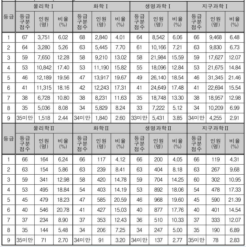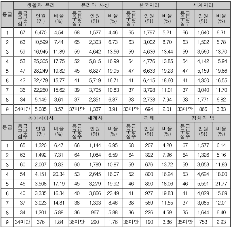 탐구영역 1등급 컷은 사회탐구 65∼68점, 과학탐구 64∼68점으로 나타나며 사회탐구 등급 컷은 지난해 점수(사탐 63∼66점)과 비교하면 다소 상승했습니다. 사회탐구 과목의 난이도가 다소 높았던 것으로 보입니다.