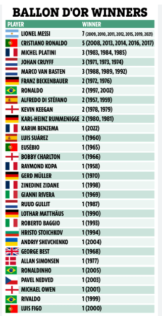 2022년에는 레알 마드리드의 카림 벤제마가 수상했습니다. 2013,14,16,17년 크리스티아누 호날두로 4번, 2018년에는 루카 모드리치가 수상했습니다. 2010년대는 리오넬 메시와 크리스티아누 호날두가 양분한 것을 알 수 있습니다. 2000년에는 루이스 피구, 2001년 마이클 오언, 2002년 호나우두, 2003년 파벨 네드베드,2004년 안드리 셰브첸코,2005년 호나우지뉴, 2006년 파비오 칸나바로, 2007년 카카, 2008년 크리스티아누 호날두가 각각 수상했습니다. 한때를 장식했던 지네딘 지단은 1998년 1회, 마르코 반바스텐 3회, 미셸 플라티니 3회, 요한 크루이프 3회, 프란츠 베켄바워도 2회를 수상한 바 있습니다.