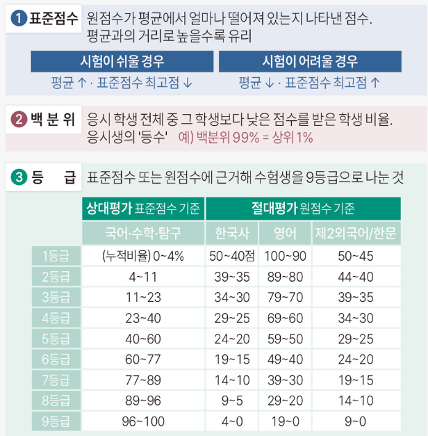 수능 성적통지표에는 표준점수, 백분위, 등급 정보가 제공됩니다. 표준점수는 수험생이 얻는 원점수(100점 만점 기준)가 평균에서 얼마나 떨어져 있는지를 알려주는 점수로 과목별 난이도를 보완하고자 제시되는 점수입니다. 백분위는 응시자의 영역별 등수를 너타내는 지표입니다. 등급은 표준점수를 기준으로 영역별로 9개의 등급으로 구분한 것입니다. 상위 4%는 1등급, 다음 7%(누적 11%)는 2등급, 3등급은 12%(누적 23%)까지입니다. 절대평가 영역인 한국사, 영어, 제2외국어, 한문은 등급만 표시됩니다.