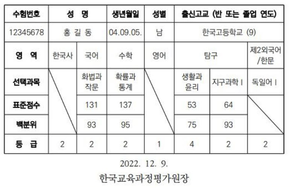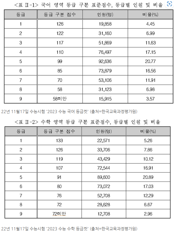 2023 수능 주요 과목 등급컷, 표준점수, 백분위 확정 결과