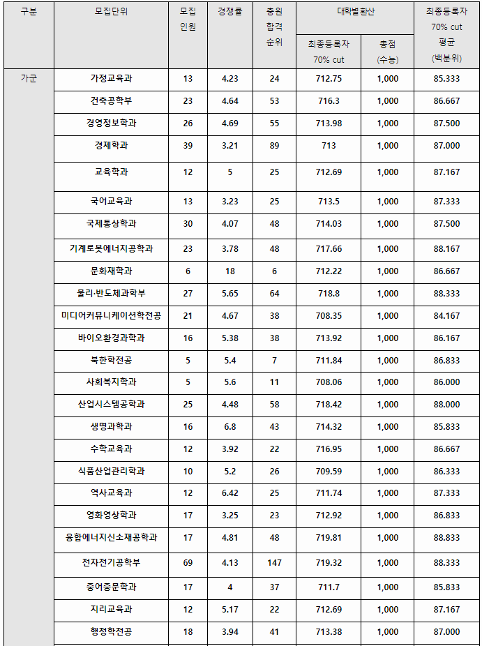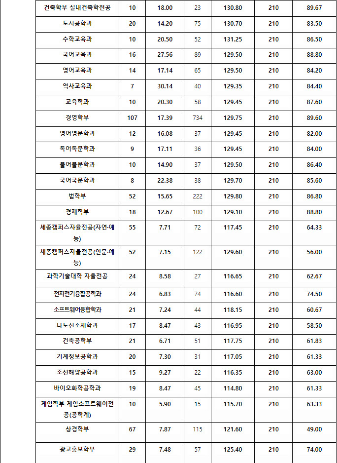 정시배치표 참고 점수입니다. 가군 수의예 395, 컴퓨터공학,전기전자공학 380, 생물공학 377, 기계항공공학 376, 건축 375, 기술경영 376, 국제무역, 글로벌비즈니스 374, 일어교육 371, 나군 미래에너지공학, 스마트ICT융합공학 376, 산업공학, 화장품공학 375, 생명과학특성, 사회환경공학 373~4, 환경보건과학 372, 축산식품생명공 371, 식량자원과학, 산림조경 369~370, 경영, 부동산 374, 국어국문, 정치외교, 의상디자인, 융합인재 373, 지리, 철학 371, 다군 융합생명공학, 줄기세포재생공, 의생명공,시스템생명공학 380~381, 미디어커뮤니케이션 374로 예상합니다.