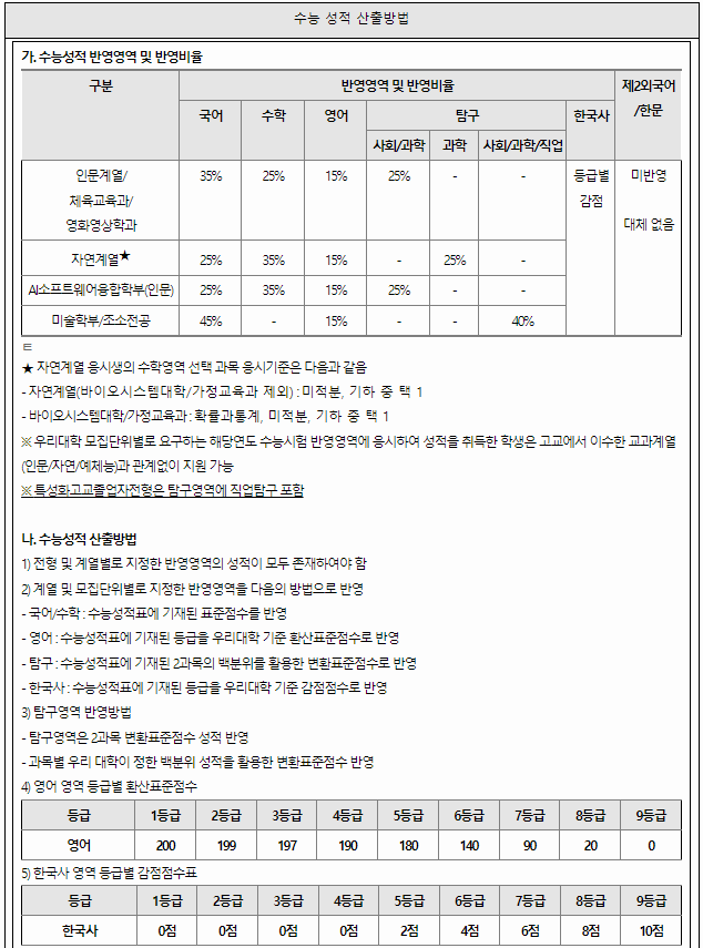 홍익대 서울캠퍼스는 나군 예체능 94, 다군 인문 376, 자연 536, 예체능 183, 자율전공 291명 등 1,386명을 선발합니다. 인문, 자연계열과 자율전공은 모두 수능100% 선발, 미술계열은 1단계에서 수능100%, 2단계에서 수능60%+서류40%로 선발합니다. 인문계열은 국어 수학 탐구 영어에 별도 선택과목을 지정하지 않지만, 자연계열은 수학에서 반드시 미적분 또는 기하를, 탐구에서 과탐을 선택해야 합니다. 국어,수학,탐구는 영역별 표준점수를 활용하며, 영어/한국사는 등급별 환산점수를 활용합니다. 탐구영역은 2과목 표준점수의 합을 반영합니다.
