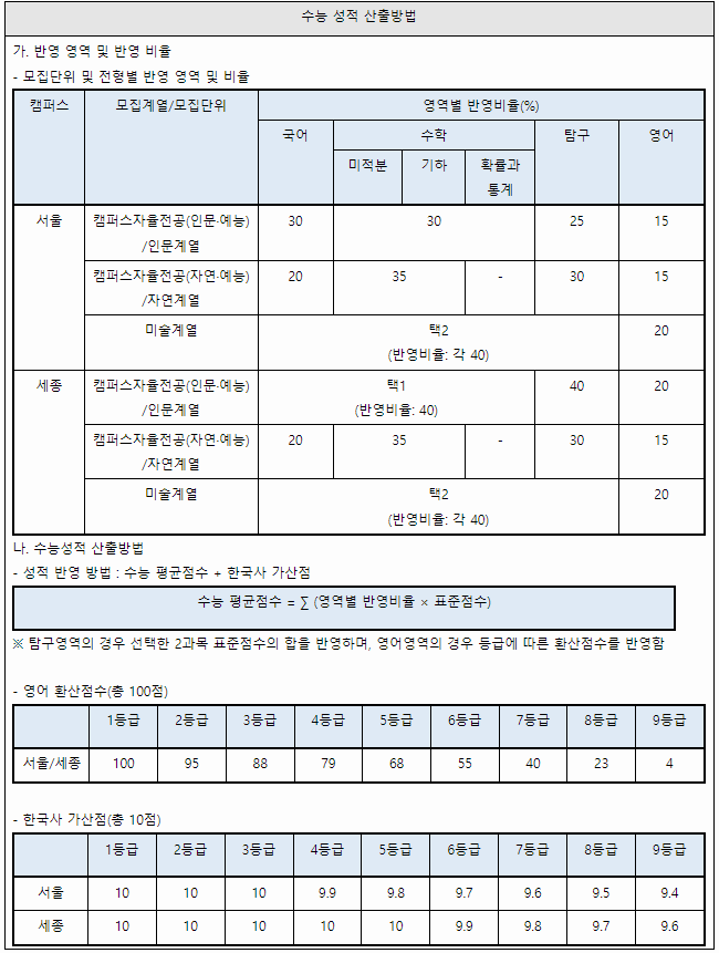 홍익대 서울캠퍼스는 나군 예체능 94, 다군 인문 376, 자연 536, 예체능 183, 자율전공 291명 등 1,386명을 선발합니다. 인문, 자연계열과 자율전공은 모두 수능100% 선발, 미술계열은 1단계에서 수능100%, 2단계에서 수능60%+서류40%로 선발합니다. 인문계열은 국어 수학 탐구 영어에 별도 선택과목을 지정하지 않지만, 자연계열은 수학에서 반드시 미적분 또는 기하를, 탐구에서 과탐을 선택해야 합니다.  국어,수학,탐구는 영역별 표준점수를 활용하며, 영어/한국사는 등급별 환산점수를 활용합니다. 탐구영역은 2과목 표준점수의 합을 반영합니다.