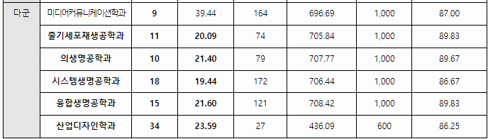 정시배치표 참고 점수입니다. 가군 수의예 395, 컴퓨터공학,전기전자공학 380, 생물공학 377, 기계항공공학 376, 건축 375, 기술경영 376, 국제무역, 글로벌비즈니스 374, 일어교육 371, 나군 미래에너지공학, 스마트ICT융합공학 376, 산업공학, 화장품공학 375,  생명과학특성, 사회환경공학 373~4, 환경보건과학 372, 축산식품생명공 371, 식량자원과학, 산림조경 369~370, 경영, 부동산 374, 국어국문, 정치외교, 의상디자인, 융합인재 373, 지리, 철학 371, 다군 융합생명공학, 줄기세포재생공, 의생명공,시스템생명공학 380~381, 미디어커뮤니케이션 374로 예상합니다.