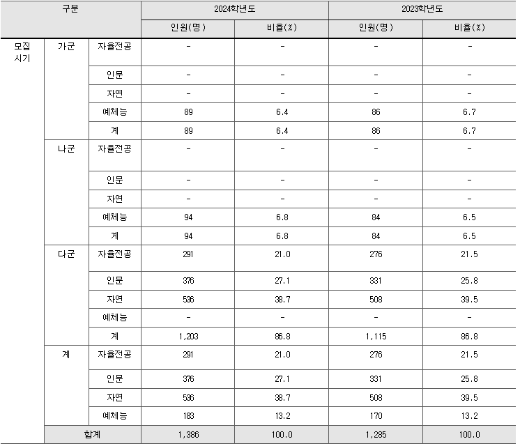 동국대 정시모집 선발인원은 가,나군 인문계 628, 자연계 595, 예체능계 56명 총 1,279명이며 2023년도와 거의 비슷합니다. 인문/자연 모두 수능100%로 선발합니다. 인문 체육교육 영화영상은 반영 비율은 국35%+수25%+영15%+탐(사/과)25%, 자연은 국25%+수(미/기)35%+영15%+탐(과)25% 입니다. 동국대 정시 원서접수 기간은 내년 1월4일부터 6일까지입니다.