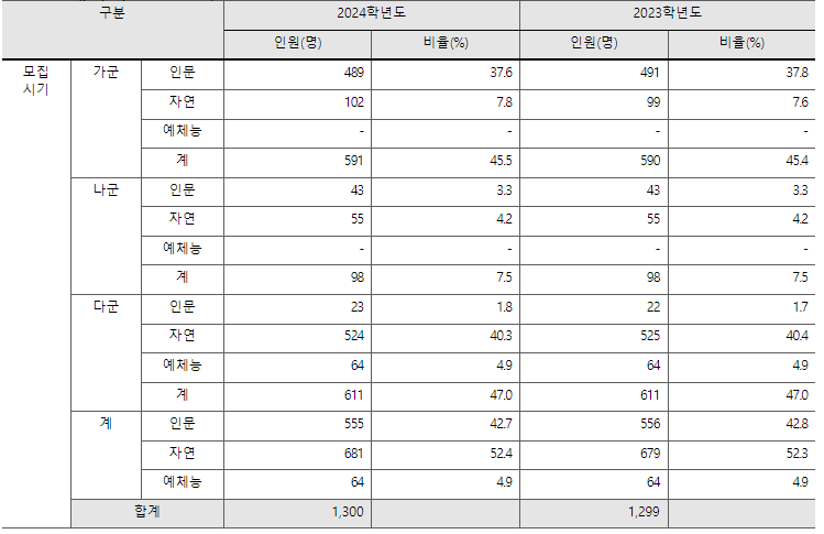 숭실대의 올해 정시 모집인원은 가군 520명, 나군 89명, 다군 544명으로 총 1153명입니다. 반영비율은 인문계열, 국35%+수25%+영20%+탐20%, 경상계열 국25%+수35%+영20%+탐20%, 자연계열 국20%+수35%+영20%+탐25%로 반영합니다. 숭실대 정시 원서접수 기간은 2024년 1월3일 오전10시부터 6일 오후6시까지입니다.