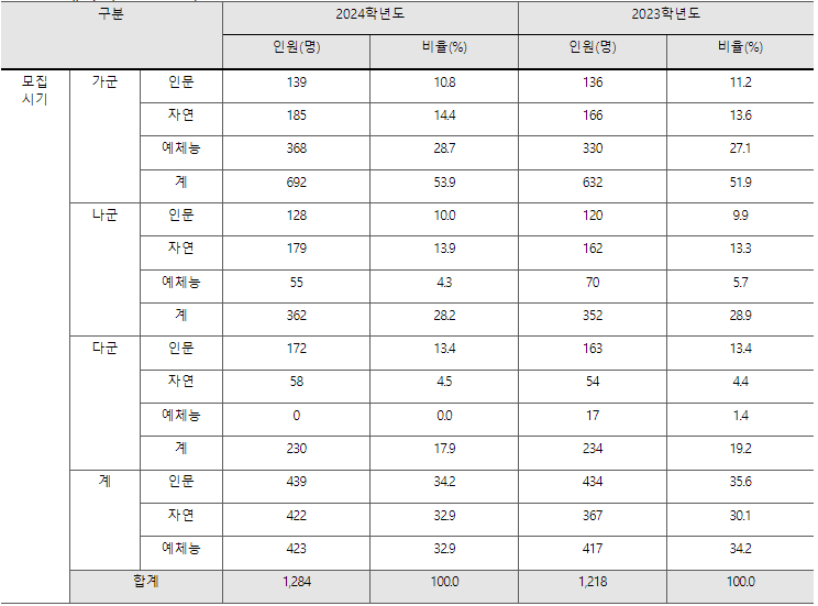 국민대는 올해 정시모집에서 정원내 1284명을 모집합니다. 모집군별로 살펴보면 가군 692명, 나군 362명, 다군 230명입니다. 수능 반영방법은 인문계 국어와 수학이 각 30%, 영어와 탐구(2과목)가 각 20%, 자연계는 수학(미/기)과 과탐(2과목)이 각 30%, 국어와 영어가 각 20%의 비중입니다. 수능 반영점수는 국어, 수학 표준점수이며 영어는 등급별 반영 배점을 적용합니다. 2024정시 원서접수는 내년 1월3일 오전10시부터 6일 오후6시까지 진행합니다.