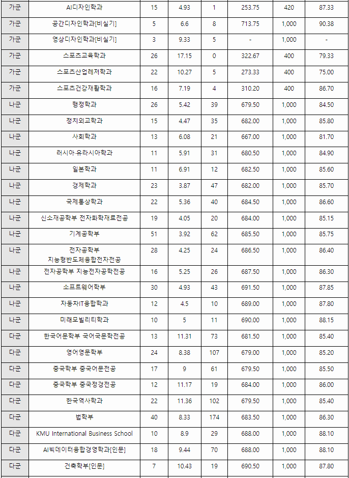 국민대 정시배치표 예상참고 점수입니다. 가군 자동차공학 371, 전자시스템공학 369, 인공지능, 바이오의약 368, 기계금속재료, 바이오발효융합 364, 식품영양 361, 시스템생명공학 359, 식물생명공학 357, 경영, 광고홍보 364, 미디어, 회계 362, 재무금융, 교육 360, 나군 자동차IT융합 372, 미래모빌리티, 소프트웨어 368, 기계공학 362, 지능전자공학 359, 전자화학재료 358, 경제 364, 행정 362, 국제통상 ,사회 361, 일본학 359, 다군 건축(인문) 372, KMU InternationalBusinessSchoo 370, AI빅데이터융합경영 368, 법학 364, 영어영문, 국어국문 363, 글로벌한국어 361, 건축(자연) 370, AI자율주행시스템공 365, 나노전자물리, 산림환경시스템 362점으로 예상합니다.